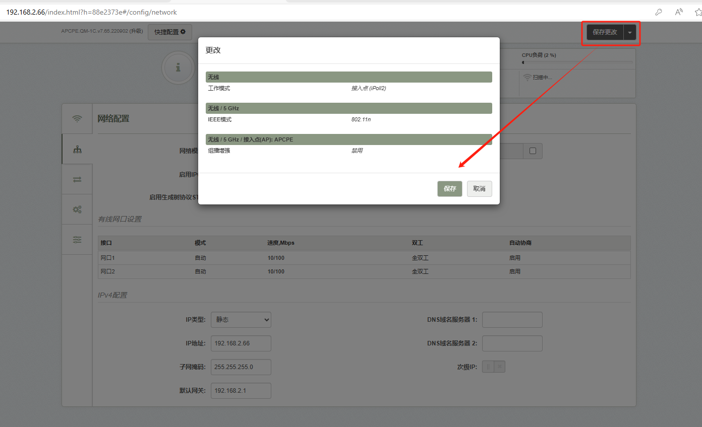網(wǎng)絡(luò)設(shè)置中可需改設(shè)備的IP ,本例中國接入點(diǎn)設(shè)備保持出廠默認(rèn)的IP信息