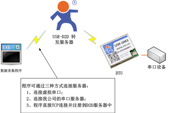 內(nèi)網(wǎng)串口軟件需要遠(yuǎn)程采集遠(yuǎn)程串口設(shè)備的數(shù)據(jù),無需搭建公網(wǎng)服務(wù)器,利用USR-D2D轉(zhuǎn)發(fā)服務(wù)器轉(zhuǎn)發(fā)GM3發(fā)送的數(shù)據(jù)到計(jì)算機(jī)。進(jìn)行遠(yuǎn)程通信。