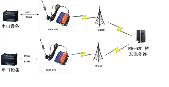 串口軟件連接GPRS-DTU。需要遠(yuǎn)程采集串口設(shè)備的數(shù)據(jù),無需搭建公網(wǎng)服務(wù)器,用戶計(jì)算機(jī)無需連接互聯(lián)網(wǎng)。利用USR-D2D轉(zhuǎn)發(fā)服務(wù)器,轉(zhuǎn)發(fā)串口設(shè)備通過DTU設(shè)備傳輸?shù)臄?shù)據(jù)到另一臺(tái)DTU。實(shí)現(xiàn)遠(yuǎn)程透明串口傳輸數(shù)據(jù),無需改變用戶原有的軟件和環(huán)境,即可實(shí)現(xiàn)遠(yuǎn)程通信。