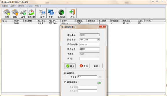 打開設(shè)置軟件“添加”選擇虛擬的串口號(hào)。網(wǎng)絡(luò)協(xié)議是TCP Client ,目標(biāo)地址是dd.usr.cn.目標(biāo)端口是25565.
