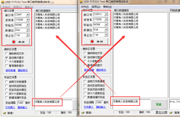 打開串口調(diào)試助手軟件,打開兩個(gè)窗口界面:一個(gè)窗口連接電腦串口com13.另一個(gè)窗口連接電腦串口com7。Com13發(fā)送的數(shù)據(jù)com7可以接收。Com7發(fā)送的數(shù)據(jù)com13可以接收。