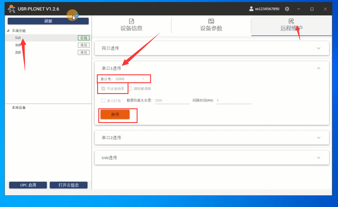 2、打開 plcnet,配置軟件選中設備點擊遠程維護,在對應的串口選擇要生成的com號,選擇同步波特率開啟透傳,按鈕狀態(tài)變更