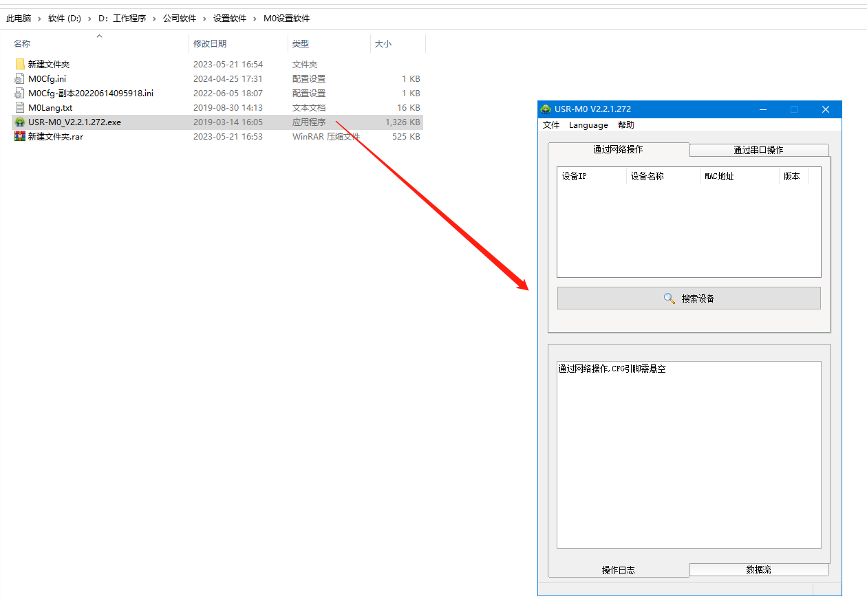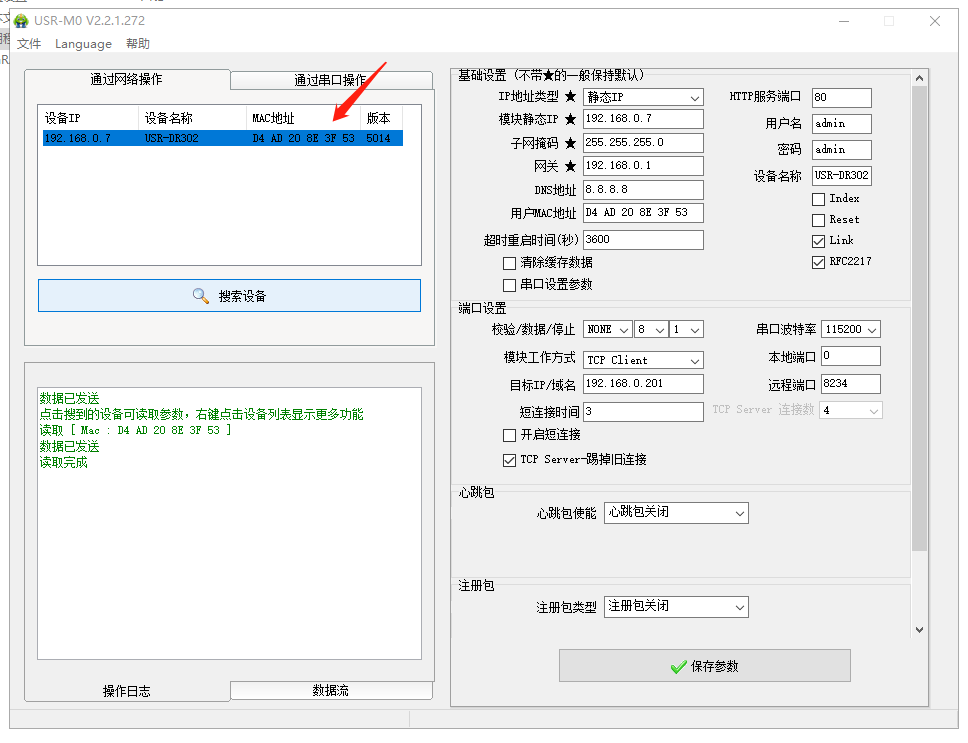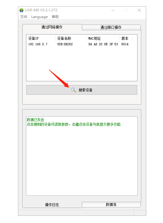 3、點(diǎn)擊M0設(shè)置軟件搜索,搜到USR-DR302的IP