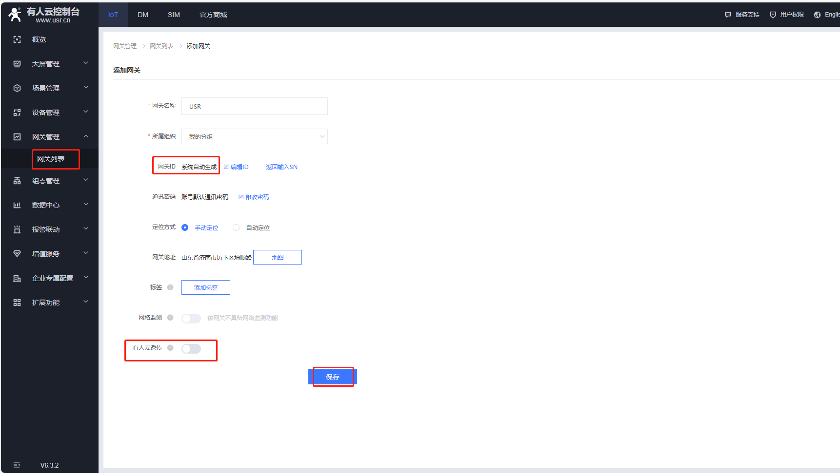 聯(lián)網(wǎng)設(shè)置,關(guān)聯(lián)網(wǎng)關(guān)選擇自身設(shè)備,USR,最后點(diǎn)擊保存。