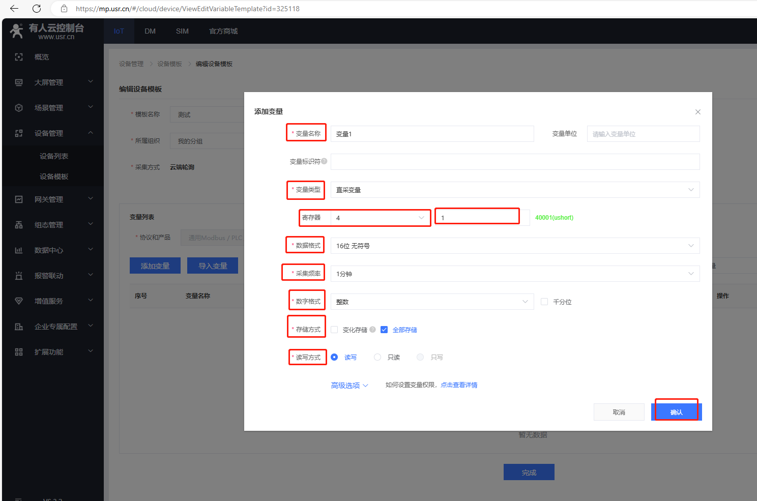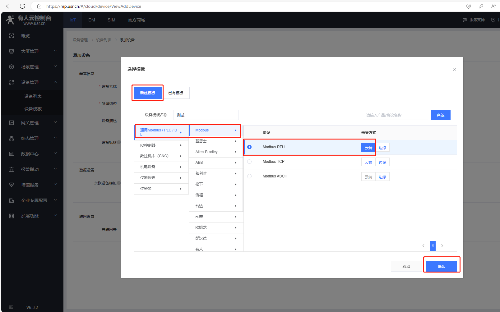 選擇新建模板,輸入設(shè)備模板名稱(chēng),通用Modbus/PLC/DL,選擇Modbus,協(xié)議選擇Modbus Rtu,采集方式云端,最后確認(rèn)。