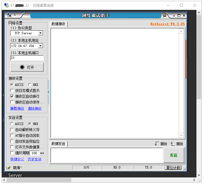 1、登陸遠程服務器,打開網(wǎng)絡助手,做TCP server,端口23,點擊打開。