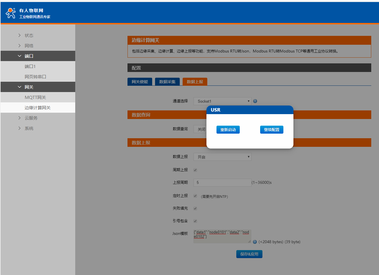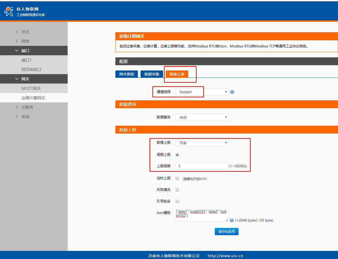 (3)點擊網(wǎng)關,點擊邊緣計算網(wǎng)關,點擊數(shù)據(jù)上報,通道選擇Socket1,數(shù)據(jù)上報開啟,周期上報勾選,上報周期5s,Json模版{"data1":"node0101","data2":"node0102"}。點擊保存&應用。