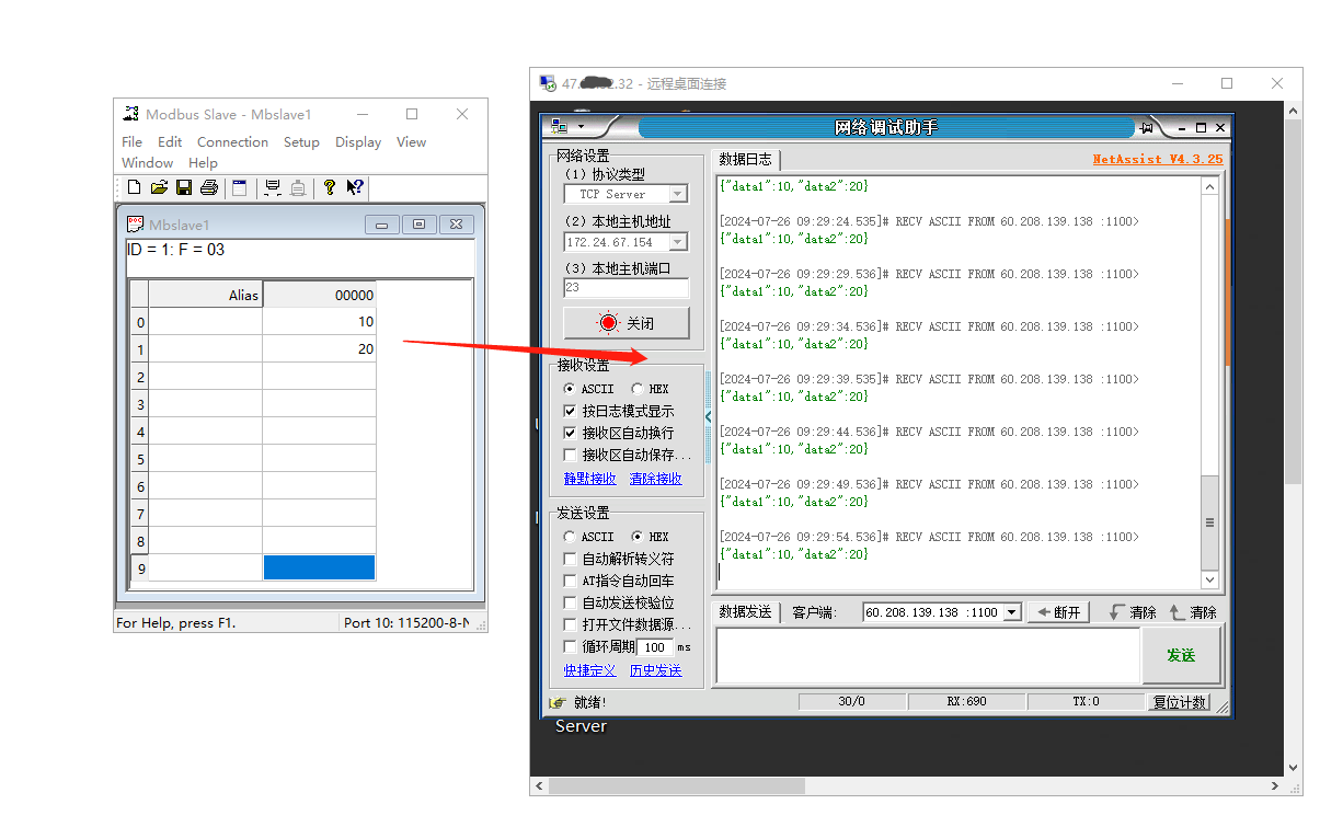 (2)遠程服務器按照上報周期,5s收到一條上報信息,{"data1":10,"data2":20}。