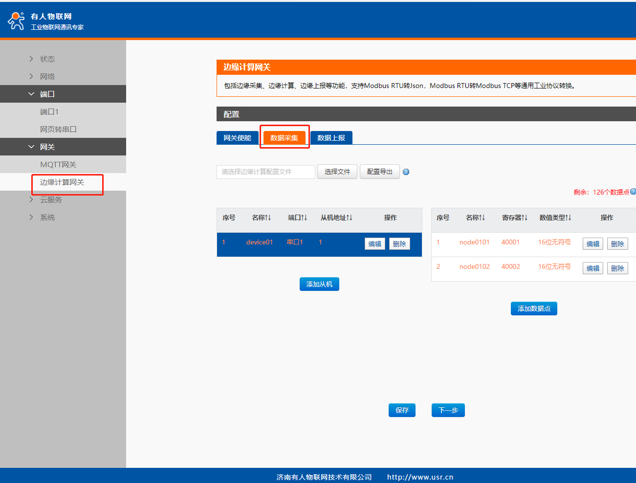 (2)點擊網(wǎng)關,點擊邊緣計算網(wǎng)關,點擊數(shù)據(jù)采集,添加從機1,添加2個數(shù)據(jù)點,第1個數(shù)據(jù)點名稱node0101,寄存器40001,對應讀取實際寄存器地址0的數(shù)據(jù)。第2個數(shù)據(jù)點名稱node0102,寄存器40002,對應讀取實際寄存器地址1的數(shù)據(jù)。點擊保存。