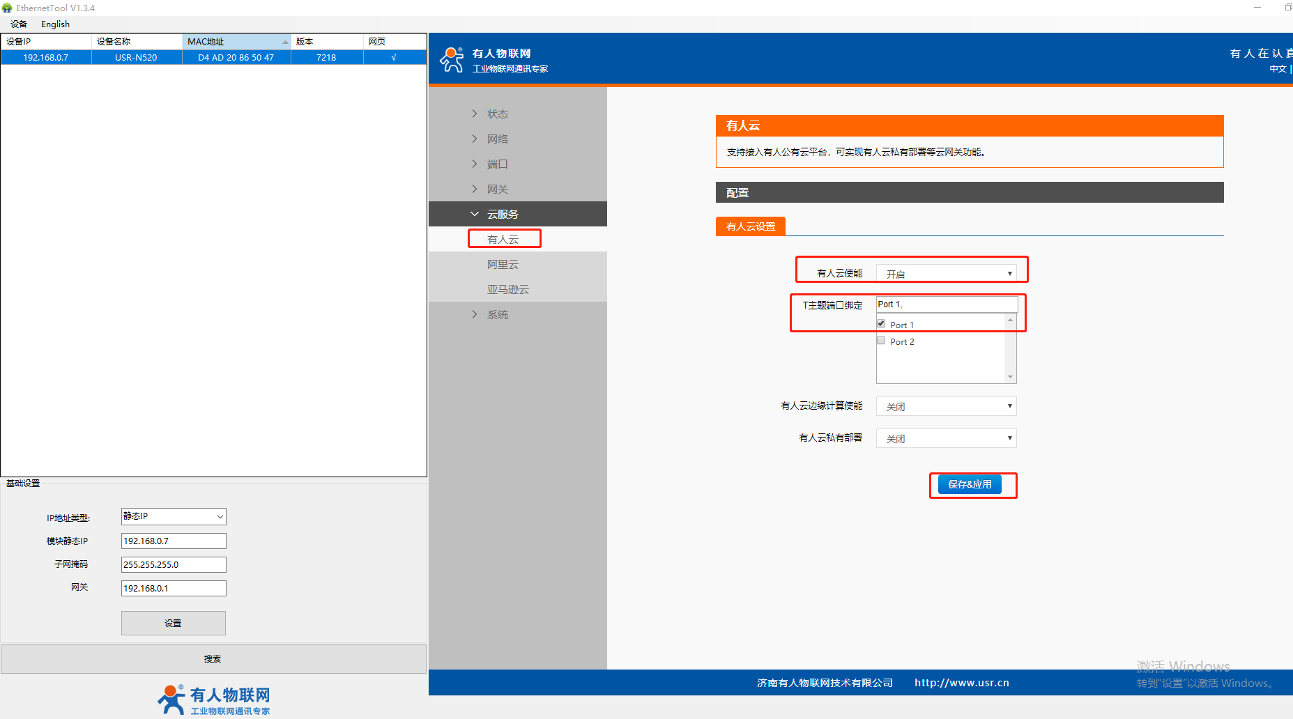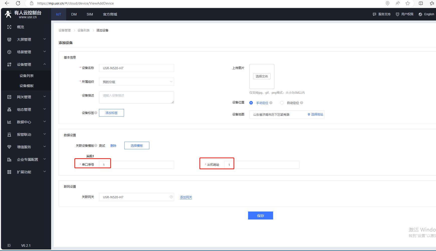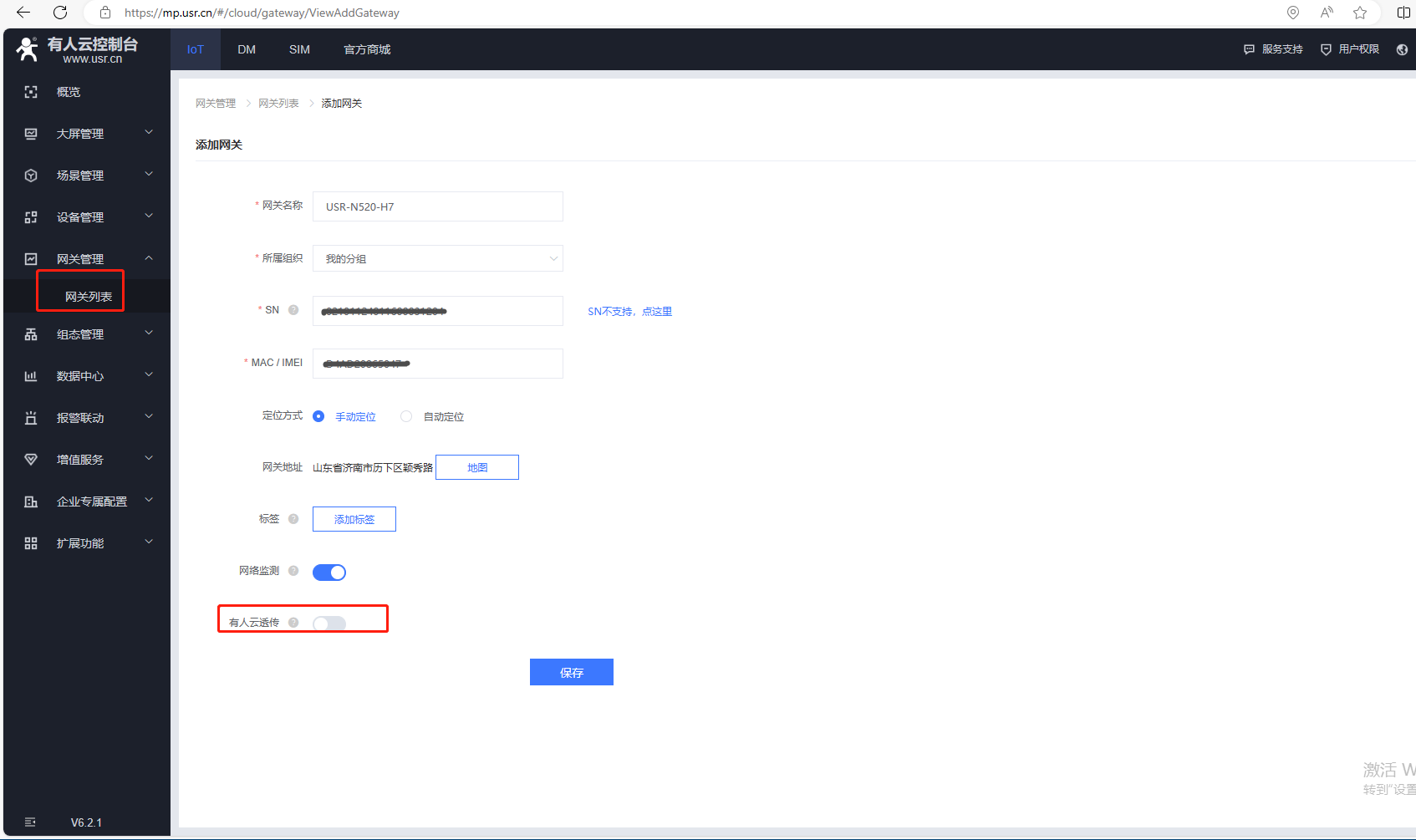 (2)USR-N520-H7用SN添加有人云,產(chǎn)品標(biāo)簽上有SN和MAC。有人云透?jìng)餍枰P(guān)閉,最后點(diǎn)擊保存。