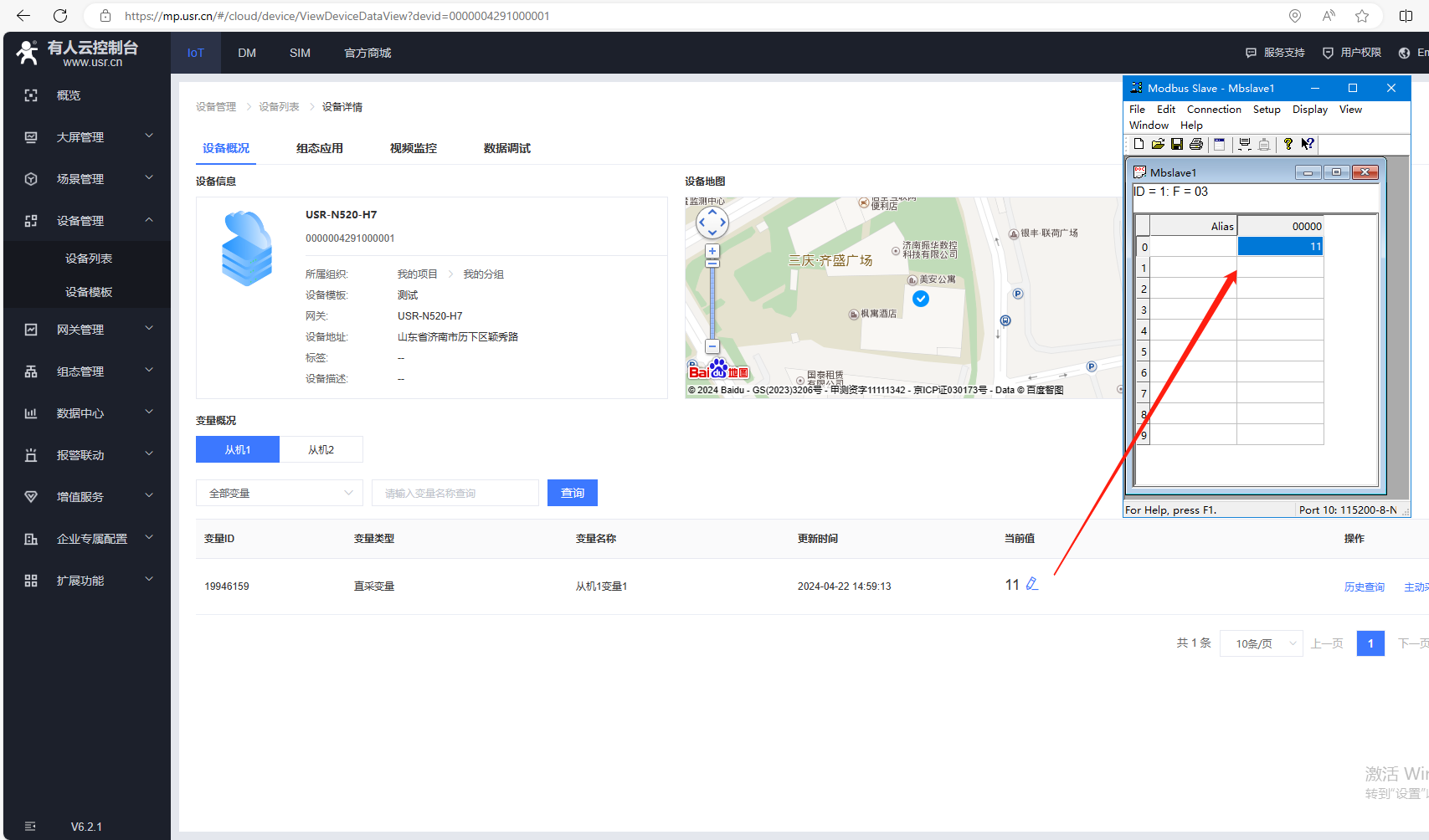 2、改變MODBUS SLAVE軟件的寄存器地址數(shù)據(jù)。COM10接的從機(jī)1,寄存器輸入10,有人云1分鐘采集數(shù)據(jù)10,有人云寫(xiě)數(shù)據(jù)11,對(duì)應(yīng)MODBUS SLAVE串口寄存器顯示數(shù)據(jù)11。