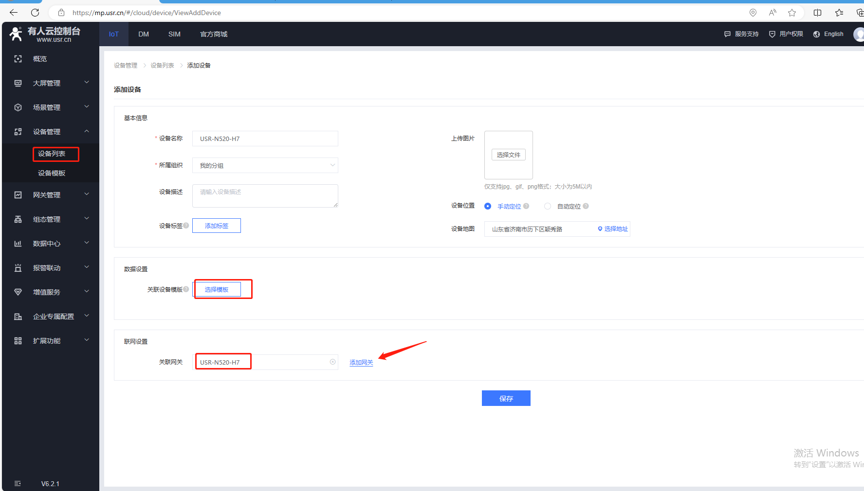 聯(lián)網(wǎng)設(shè)置,關(guān)聯(lián)網(wǎng)關(guān)選擇自身設(shè)備,USR-N520-H7,最后點(diǎn)擊保存。