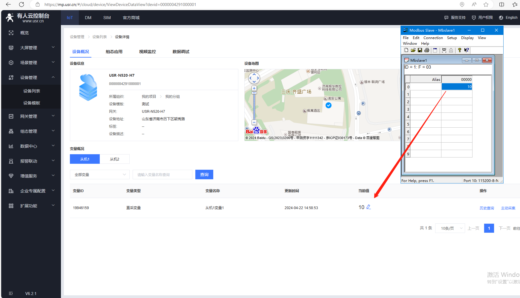 如果有實(shí)際MODBUS RTU串口從機(jī)設(shè)備,可以直接接產(chǎn)品串口,串口參數(shù)設(shè)置一致,測(cè)試有人云云端輪詢(xún)采集從機(jī)數(shù)據(jù)功能。