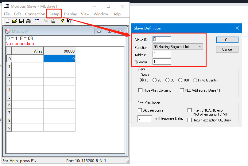 (1)點(diǎn)擊Setup,Slave ID從機(jī)地址用1,F(xiàn)unction功能碼用03,Address寄存器起始地址用0,Quantity寄存器地址數(shù)量用1。