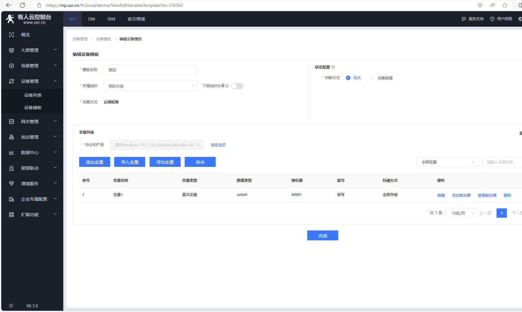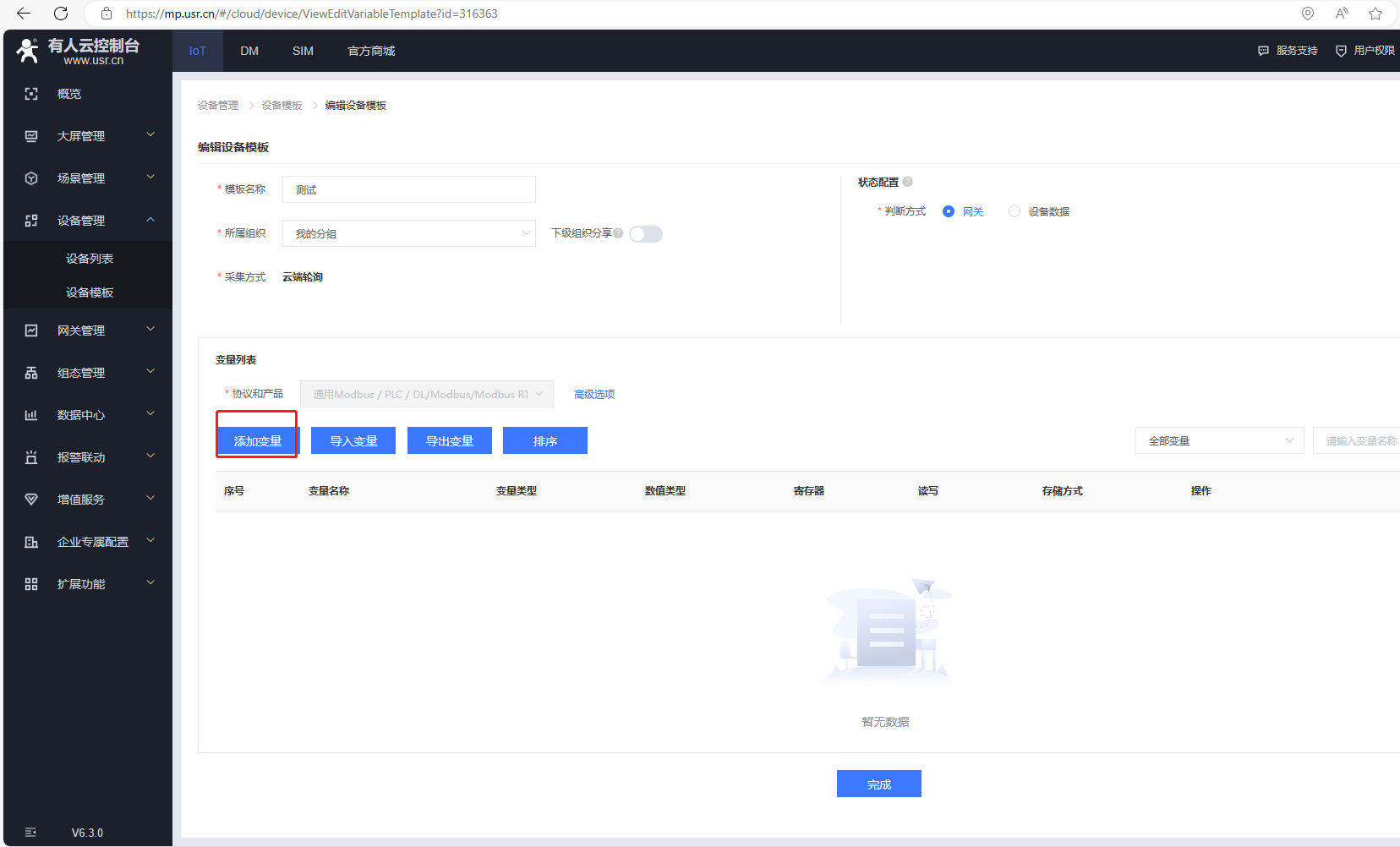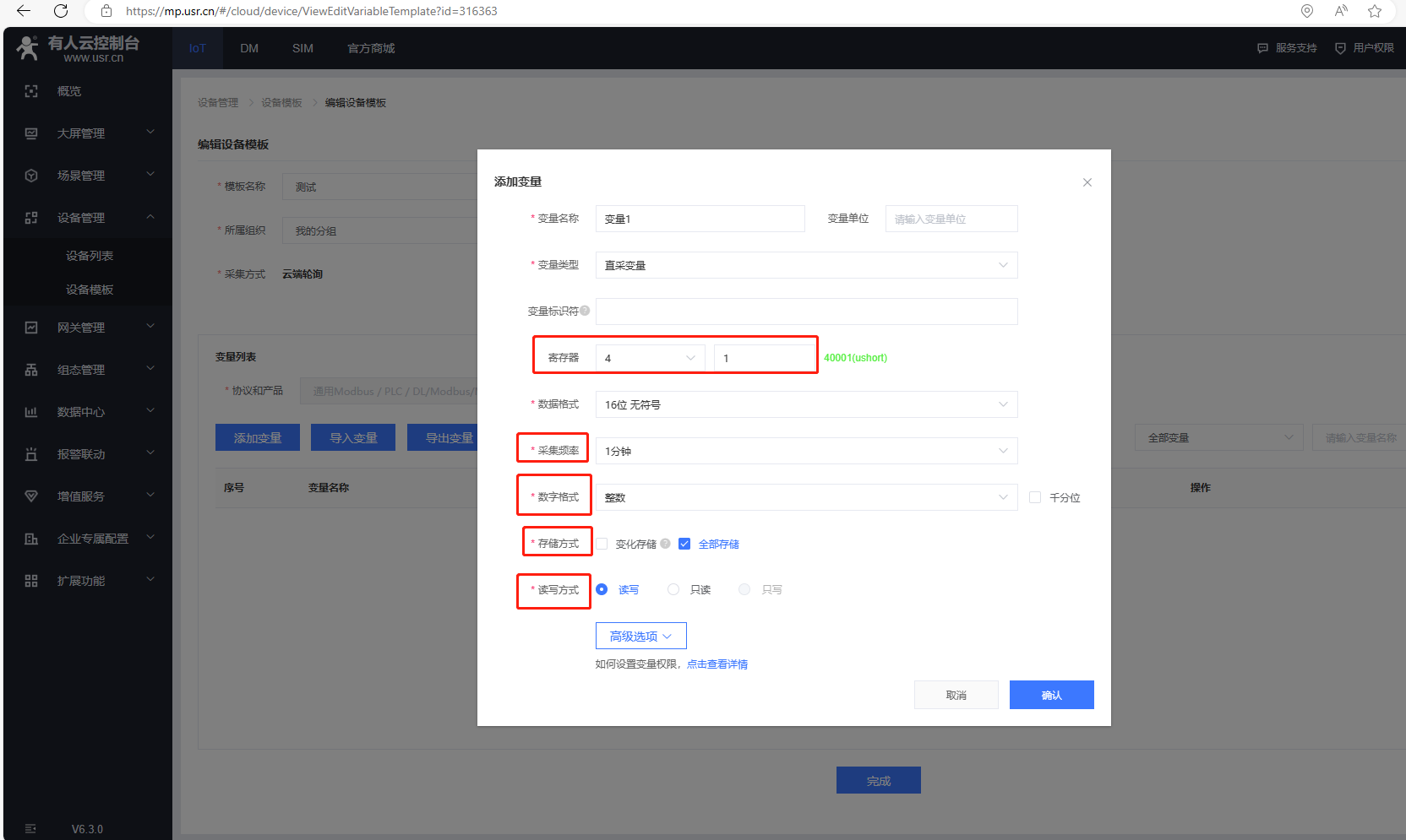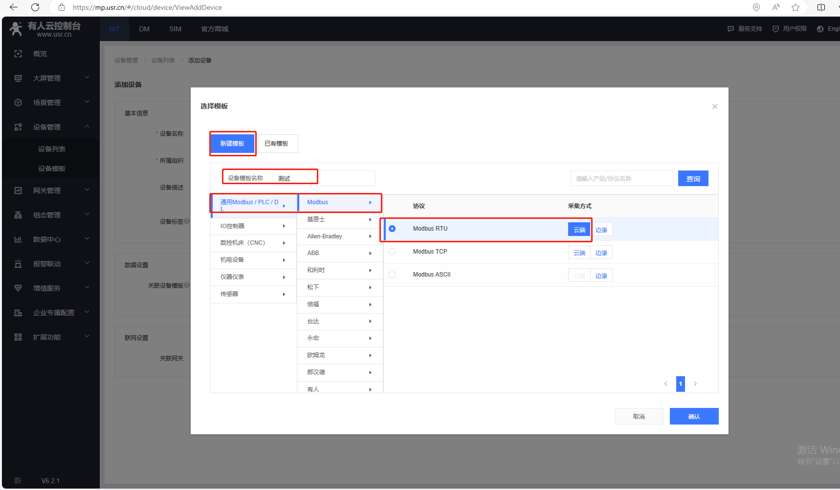 選擇新建模板,輸入設(shè)備模板名稱(chēng),通用Modbus/PLC/DL,選擇Modbus,協(xié)議選擇Modbus Rtu,采集方式云端,最后確認(rèn)。