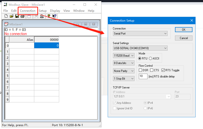 (2)點(diǎn)擊Connection,選擇串口,對(duì)應(yīng)USR-N520-H7所接USB-RS485串口線的COM口號(hào),串口參數(shù)和USR-N520-H7串口參數(shù)保持一致。 Mode選擇RTU,模擬MODBUS RTU協(xié)議串口。