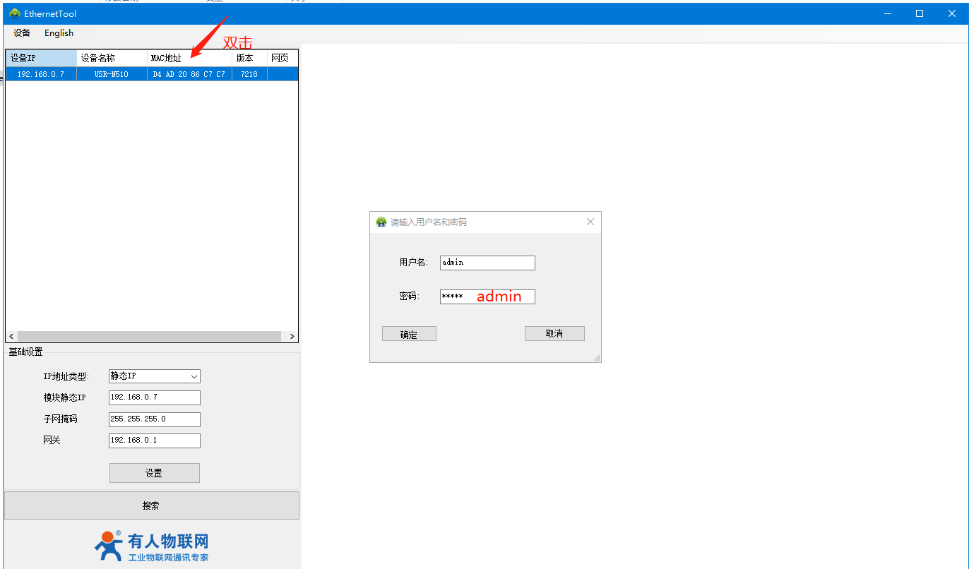 N510和電腦網(wǎng)線直連,打開H7軟件,搜到N510的IP。用戶名和密碼都是admin。