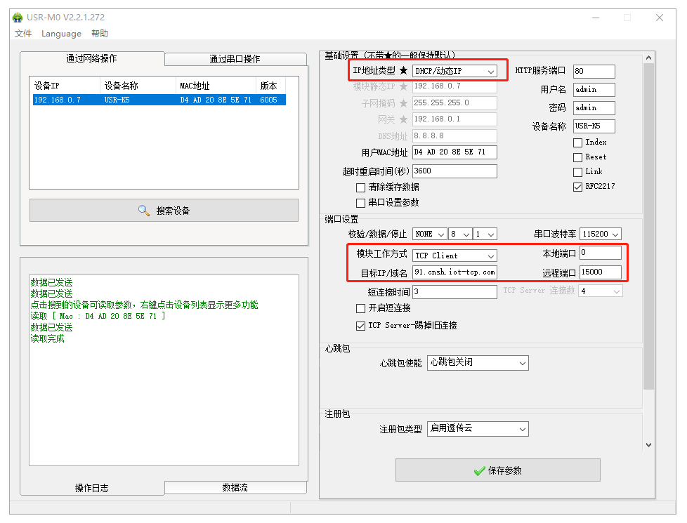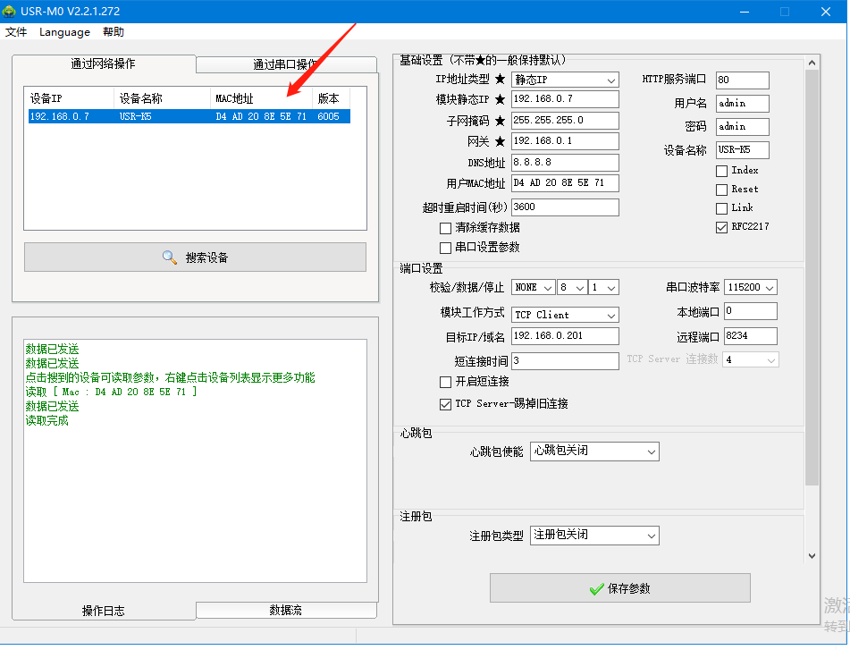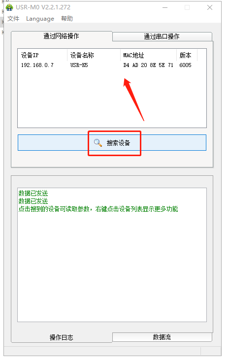 USR-K5和電腦網(wǎng)線直連,打開M0軟件,搜到USR-K5的IP。