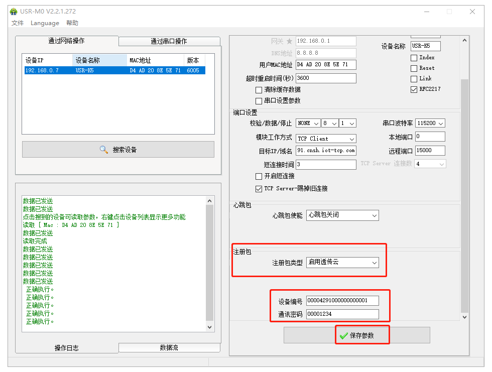 (3)注冊包設(shè)置,注冊包類型選擇啟用透傳云,設(shè)備編碼:00004291000000000001,通訊密碼00001234。