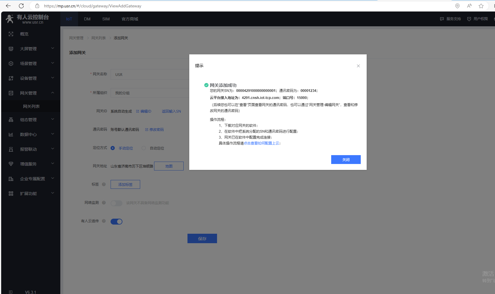 添加完,有人云,網(wǎng)關列表,USR-VCOM在線。