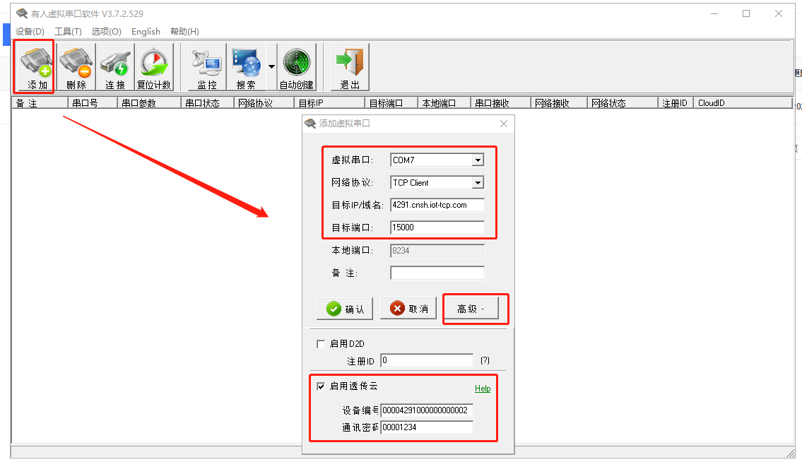 高級(jí)設(shè)置開啟透?jìng)髟?,輸入有人云添加設(shè)備的編號(hào)ID00004291000000000002和密碼00001234,點(diǎn)擊確認(rèn)。