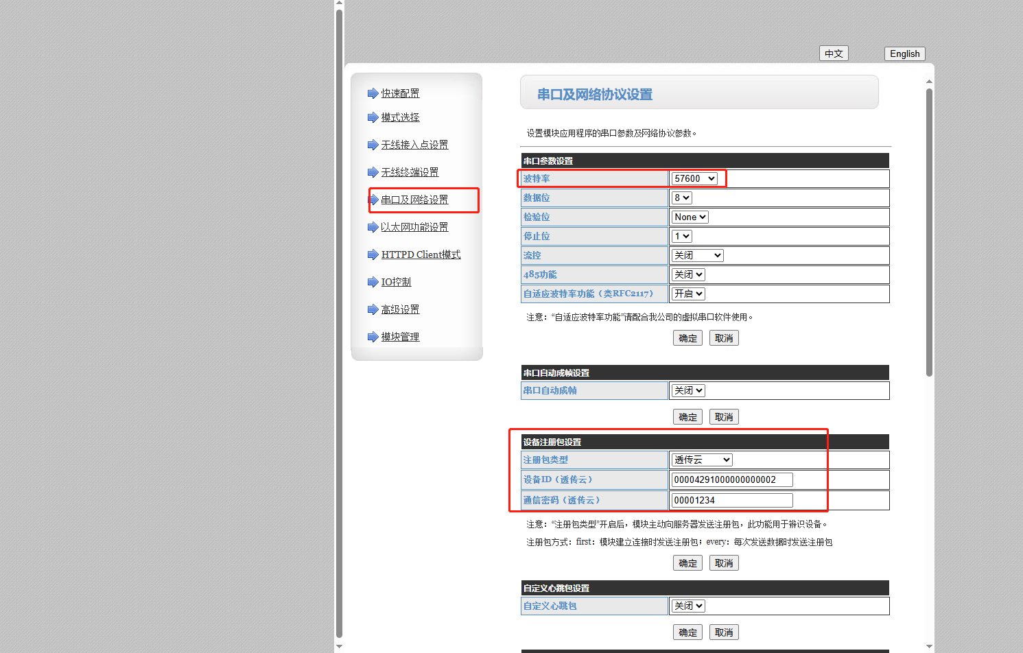 開啟注冊包,選擇透傳云,設備ID填添加有人云的ID 00004291000000000002,通信密碼填00001234,點擊確定。