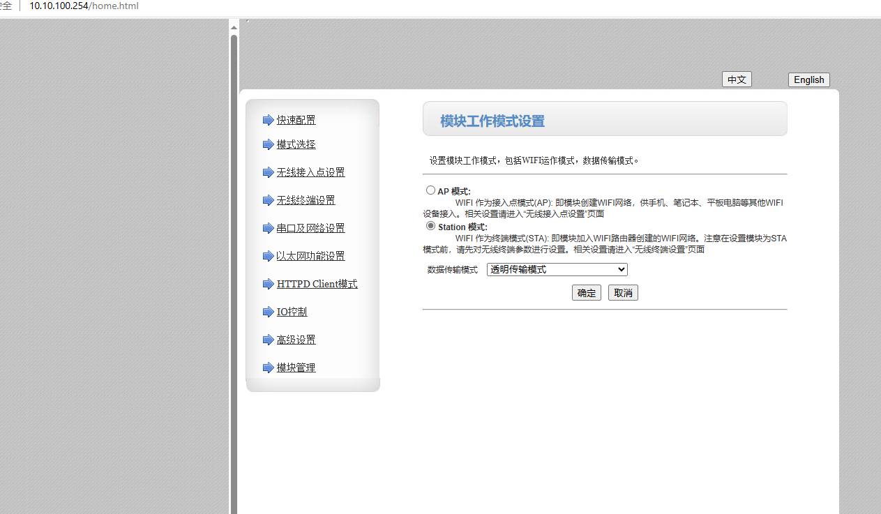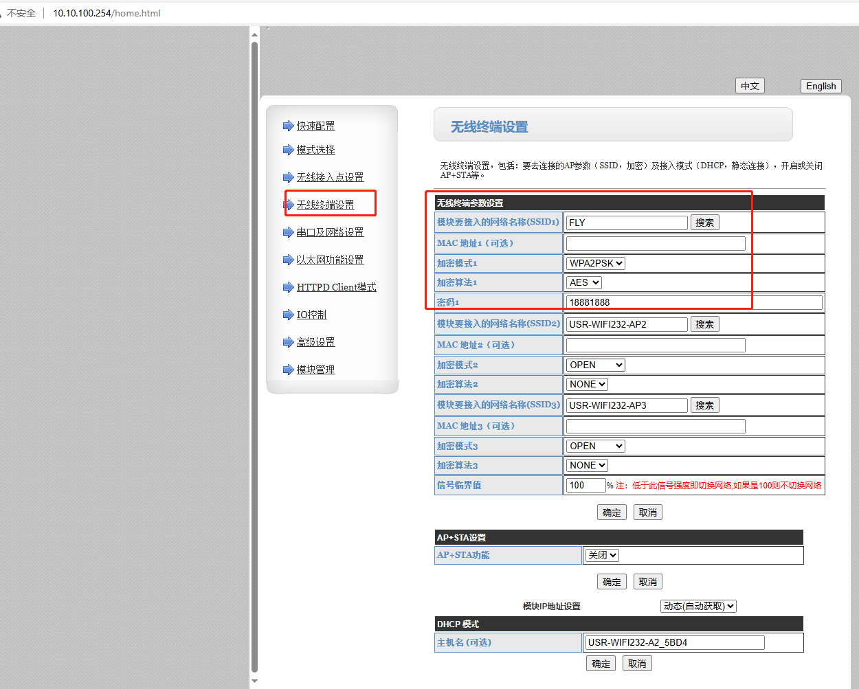 (1)電腦連接USR-WIFI232-B2的WiFi,瀏覽器輸入10.10.100.254登陸網(wǎng)頁