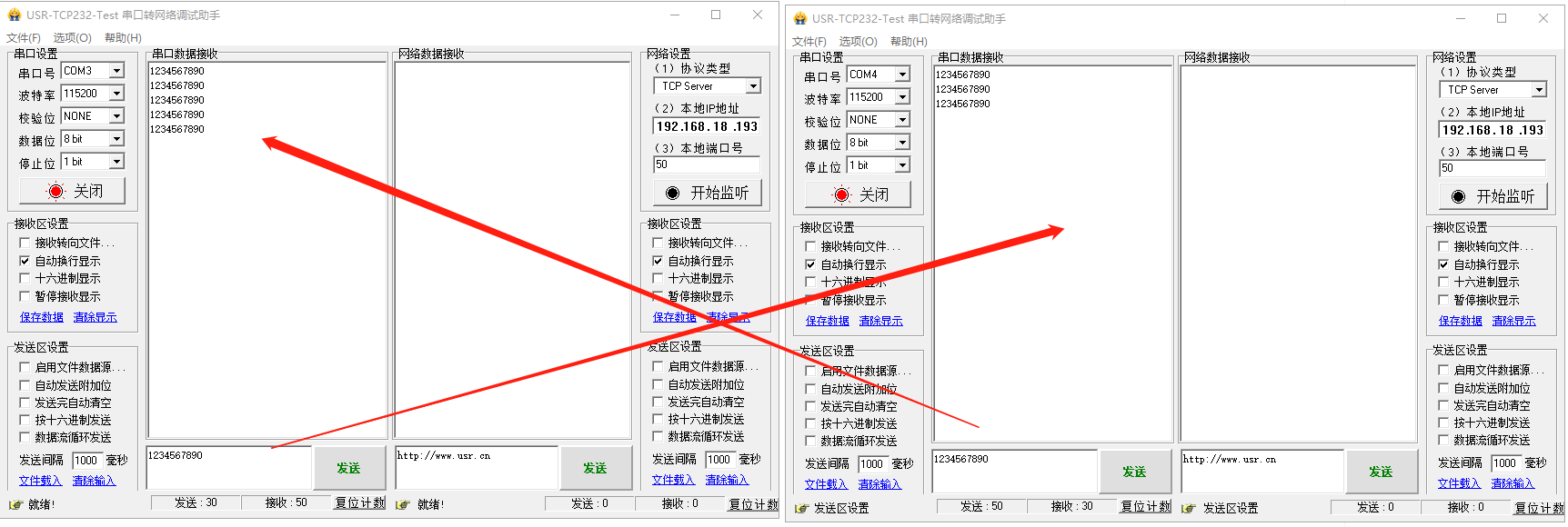 2、測試實際2個USR-WIFI232-B2的串口之間數(shù)據(jù)通訊。
