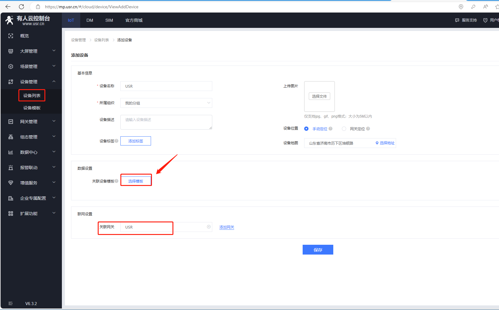 聯(lián)網(wǎng)設(shè)置,關(guān)聯(lián)網(wǎng)關(guān)選擇自身設(shè)備,USR,最后點(diǎn)擊保存。