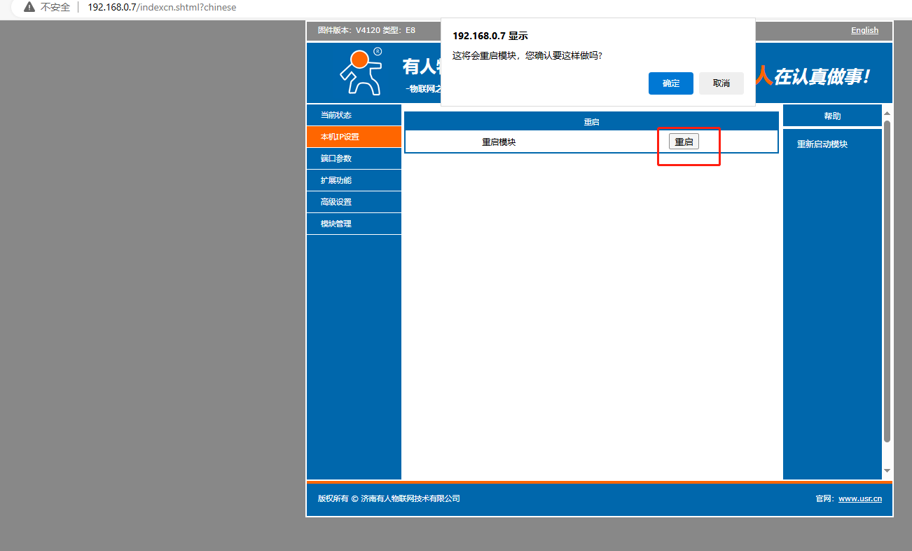 6、重啟模塊。重啟完之后,USR-TCP232-T2的網(wǎng)口用網(wǎng)線連接可以上外網(wǎng)的路由器LAN口。