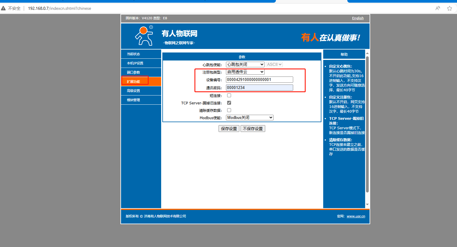 4、擴(kuò)展功能,注冊(cè)包類型,啟用透?jìng)髟?。設(shè)備編號(hào)填00004291000000000001,通訊密碼填00001234。點(diǎn)擊保存設(shè)置。