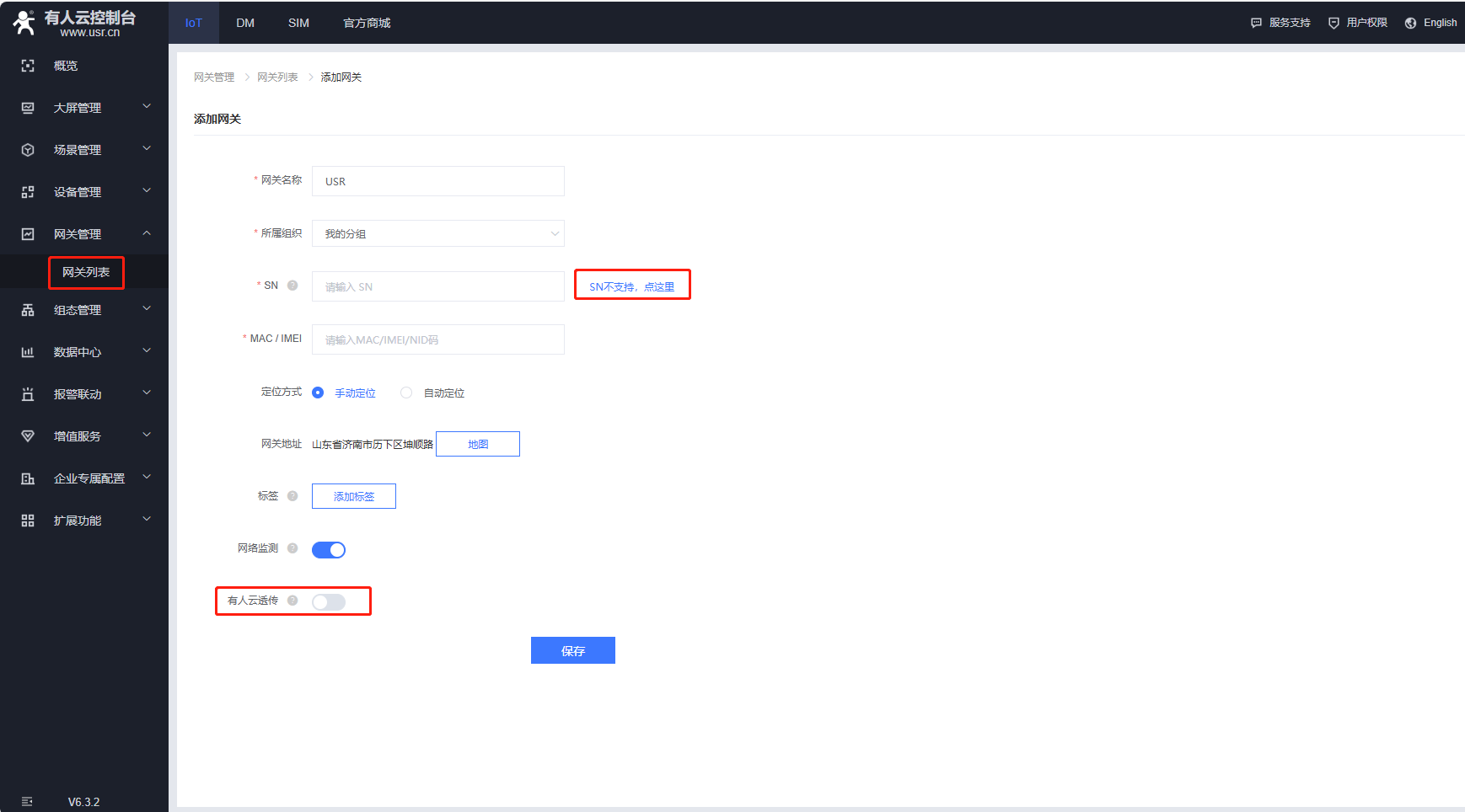 (2)USR不支持SN添加有人云的產(chǎn)品,在有人云添加網(wǎng)關(guān)的時(shí)候,點(diǎn)擊SN不支持點(diǎn)這里,自動(dòng)生成ID和密碼,有人云透?jìng)餍枰P(guān)閉,最后點(diǎn)擊保存。