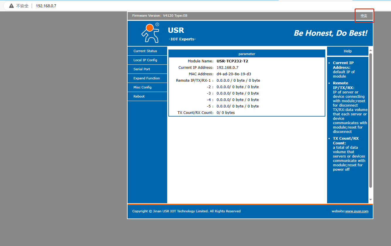 1、USR-TCP232-T2網(wǎng)線和電腦直連,IP同網(wǎng)段,瀏覽器輸入19.168.0.7登陸T2網(wǎng)頁(yè),用戶名和密碼都是admin。