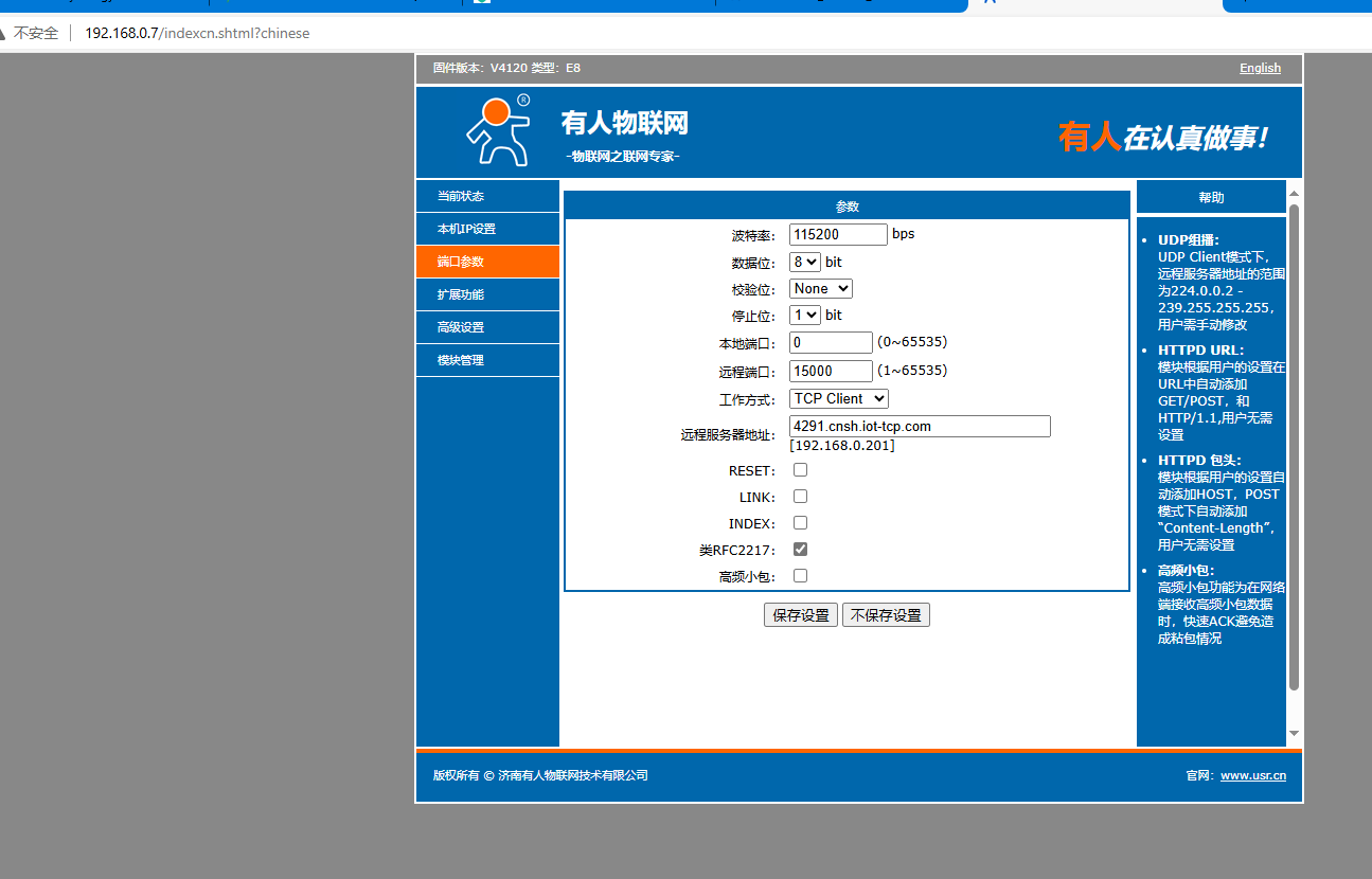 3、端口參數(shù)設(shè)置,串口參數(shù)默認(rèn)(實(shí)際應(yīng)用和所接串口設(shè)備串口參數(shù)設(shè)置一致),遠(yuǎn)程端口15000,工作方式TCP Client,遠(yuǎn)程服務(wù)器地址4291.cnsh.iot-tcp.com,點(diǎn)擊保存設(shè)置。