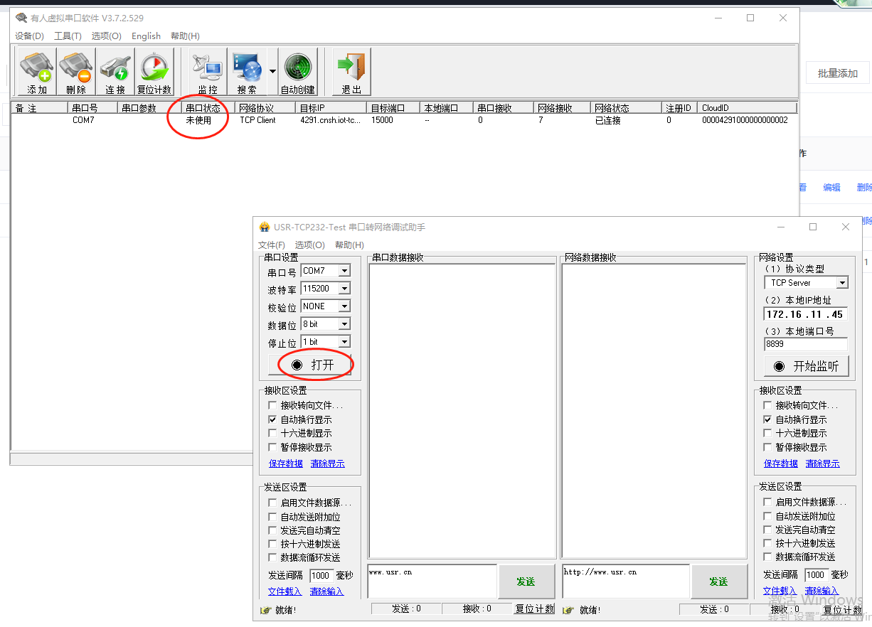 USR-TCP232-T2上云和虛擬串口軟件(V3版本)一對(duì)一通訊示例