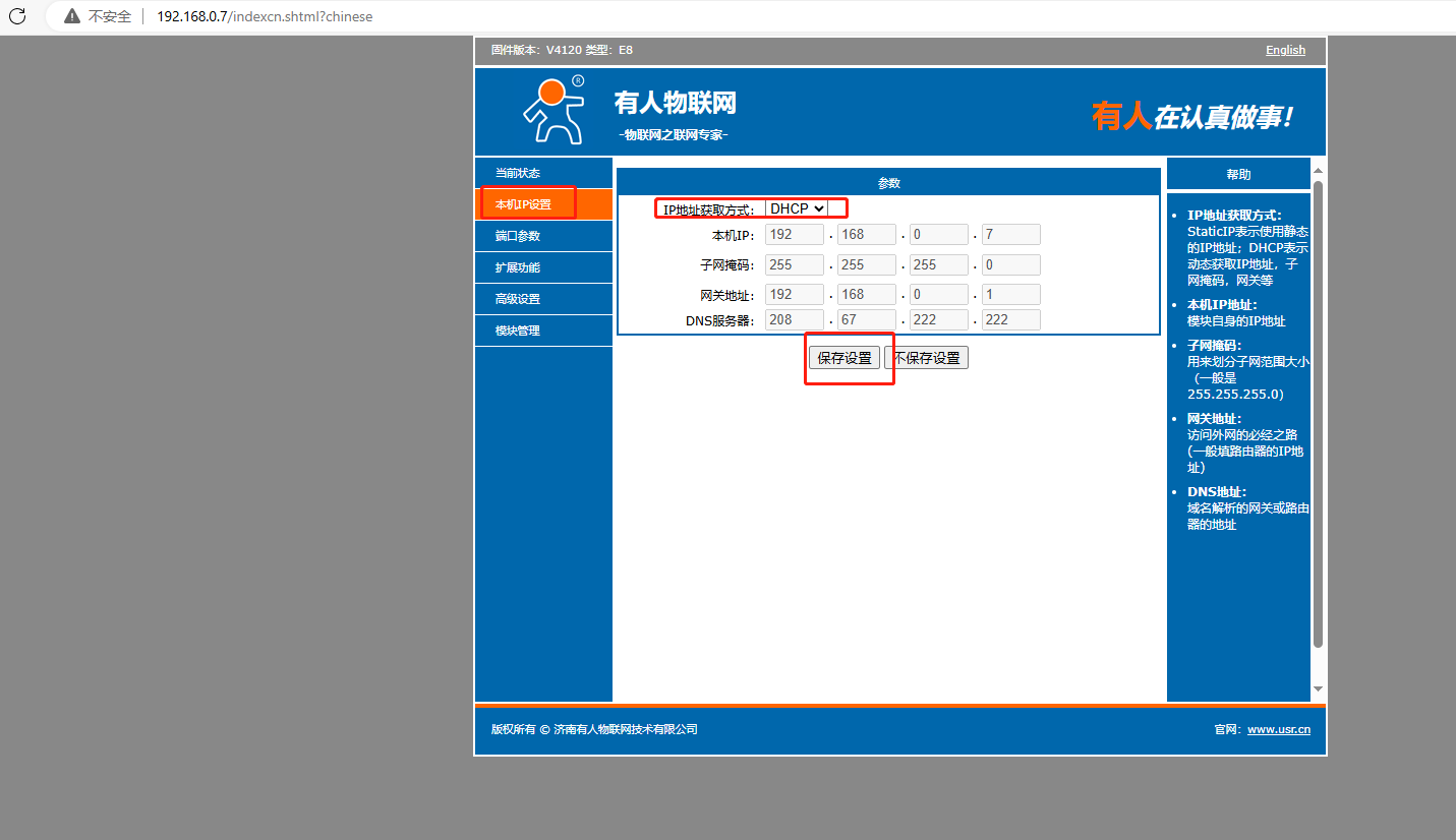5、本機(jī)IP設(shè)置,IP地址獲取方式選擇DHCP,點(diǎn)擊保存設(shè)置。