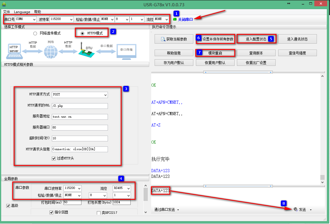 實現(xiàn)功能:實現(xiàn)串口設(shè)備發(fā)送數(shù)據(jù),通過USR-G780模塊,可以直接發(fā)送到網(wǎng)頁服務(wù)器上,網(wǎng)頁服務(wù)器可以接收數(shù)據(jù),對數(shù)據(jù)進行判斷存儲等操作,web服務(wù)器根據(jù)串口設(shè)備請求數(shù)據(jù),反饋相應(yīng)的控制指令。