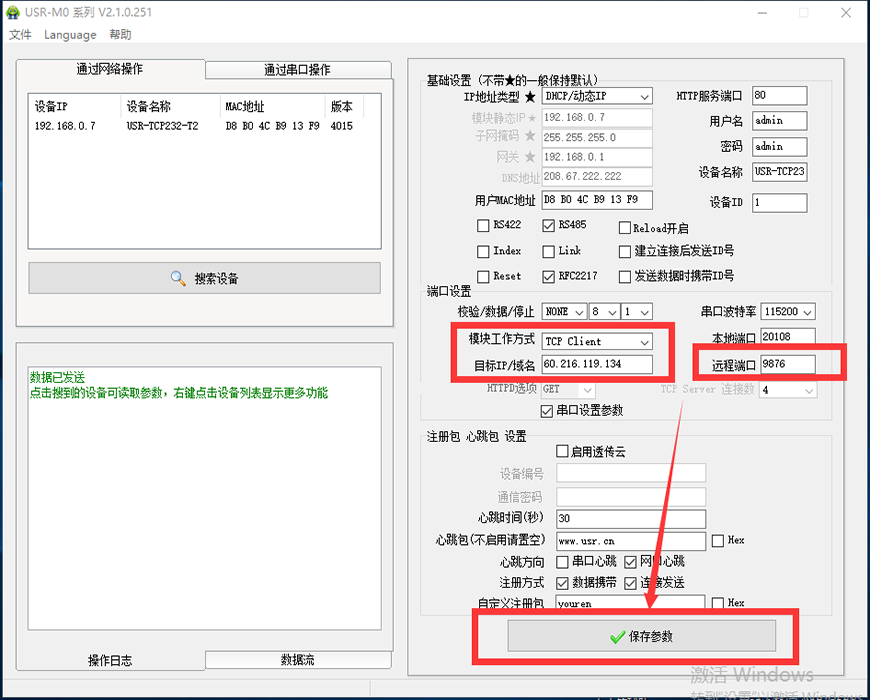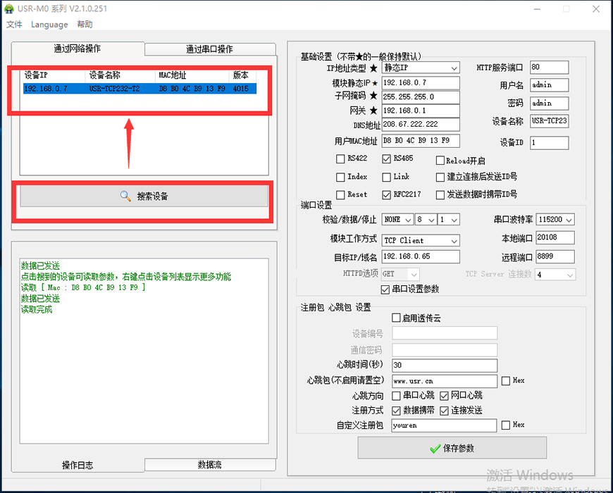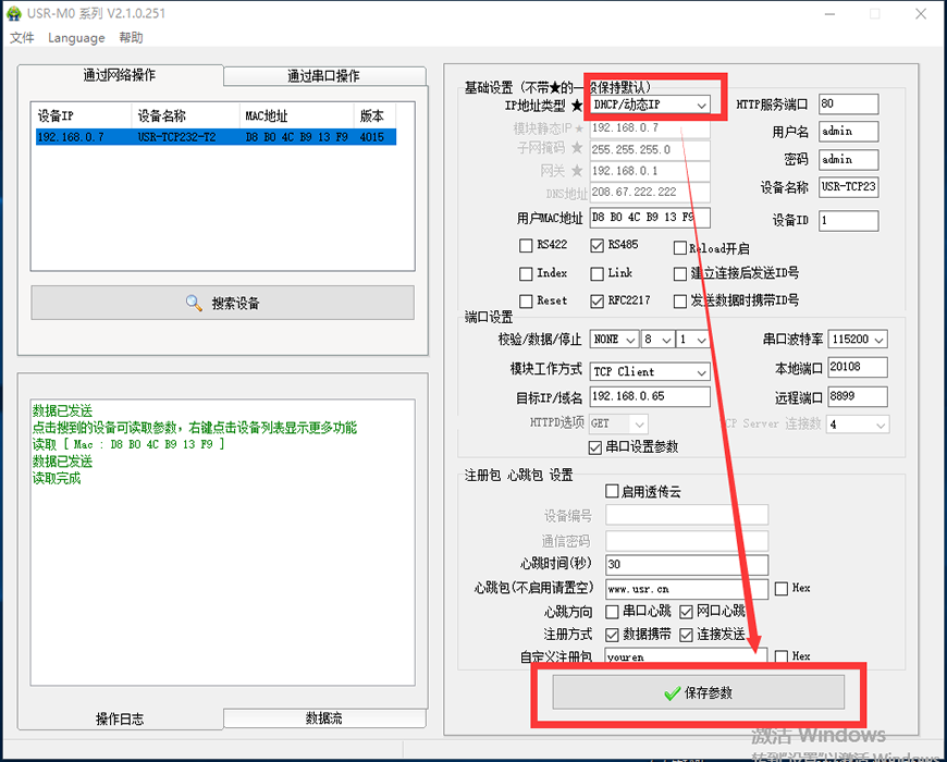 5、打開參數(shù)設(shè)置軟件USR-TCP232-M0-V2.1.0.251.exe ,點(diǎn)擊“搜索設(shè)備”,點(diǎn)擊搜索到的模塊IP,選擇是通過RS485串口還是RS232串口進(jìn)行通信,此處以RS232串口舉例,配置參數(shù)如圖,點(diǎn)擊“保存參數(shù)”