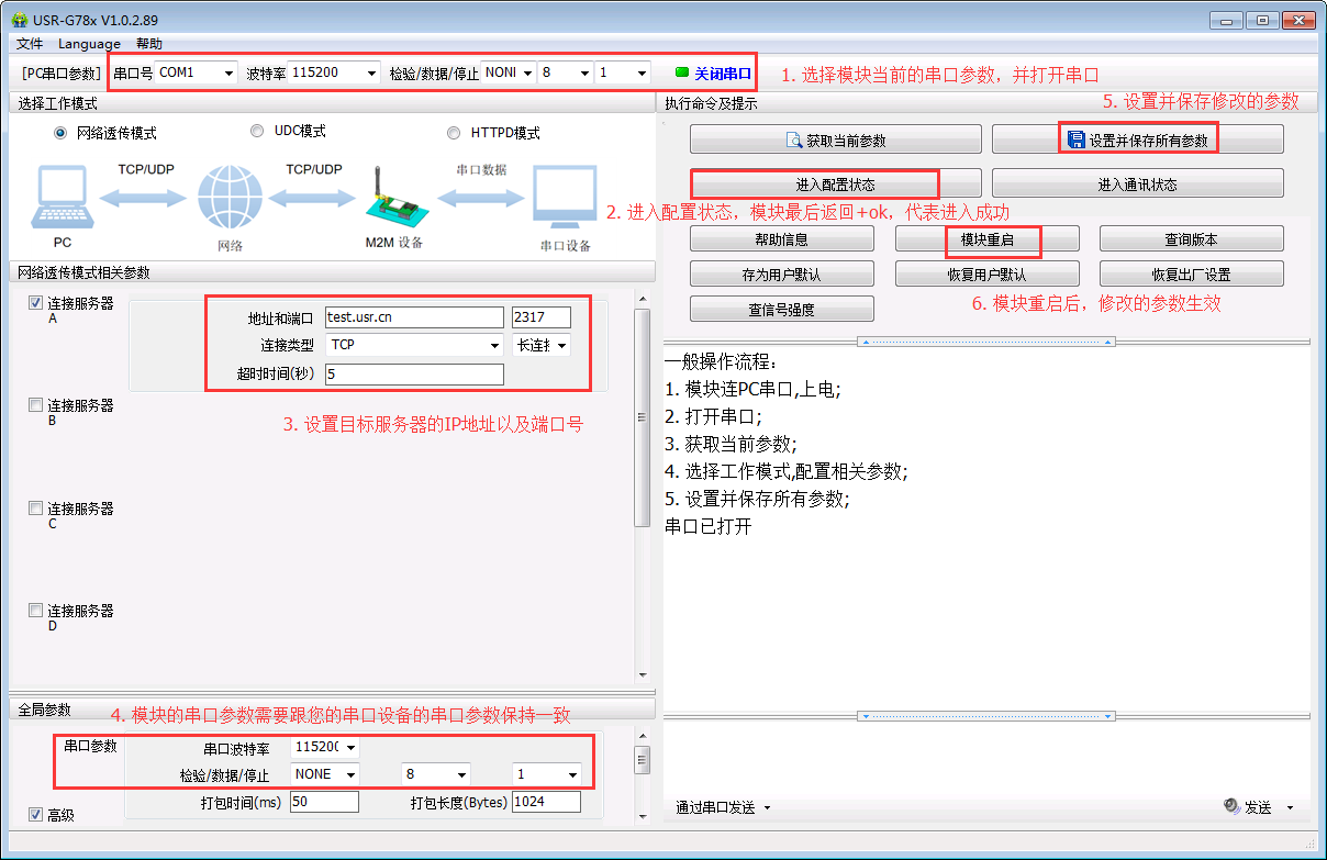 (1)設置之前必須將4G模塊的串口連接電腦的串口,然后打開設置軟件設置參數