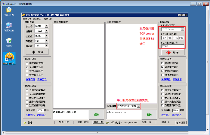 (3) 服務器接收和發(fā)送串口GPRS模塊的串口數據。