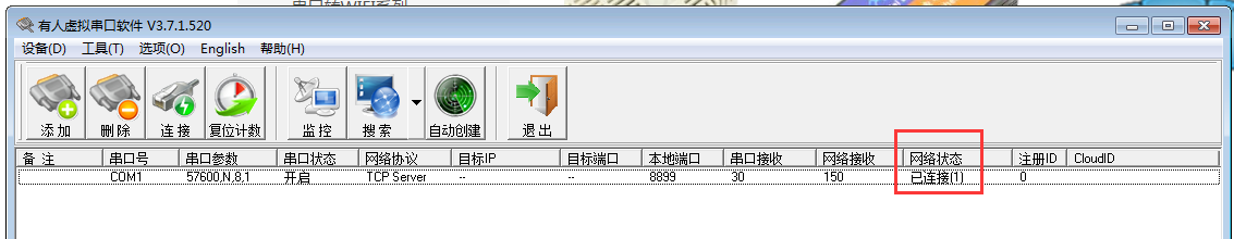 如使用一個GPRS DTU建立連接時會在網(wǎng)絡(luò)狀態(tài)上顯示已連接(1)。網(wǎng)絡(luò)狀態(tài)如果一直顯示監(jiān)聽狀態(tài),請檢查之前設(shè)置參數(shù)是否有誤