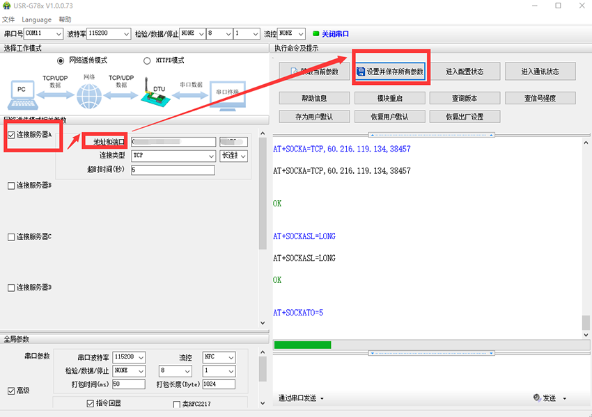 3、勾選連接服務(wù)器A,地址設(shè)置為公網(wǎng)服務(wù)器的公網(wǎng)IP,端口號為服務(wù)器上上位機(jī)軟件的端口號。點(diǎn)擊“設(shè)置并保存所有參數(shù)”,如圖