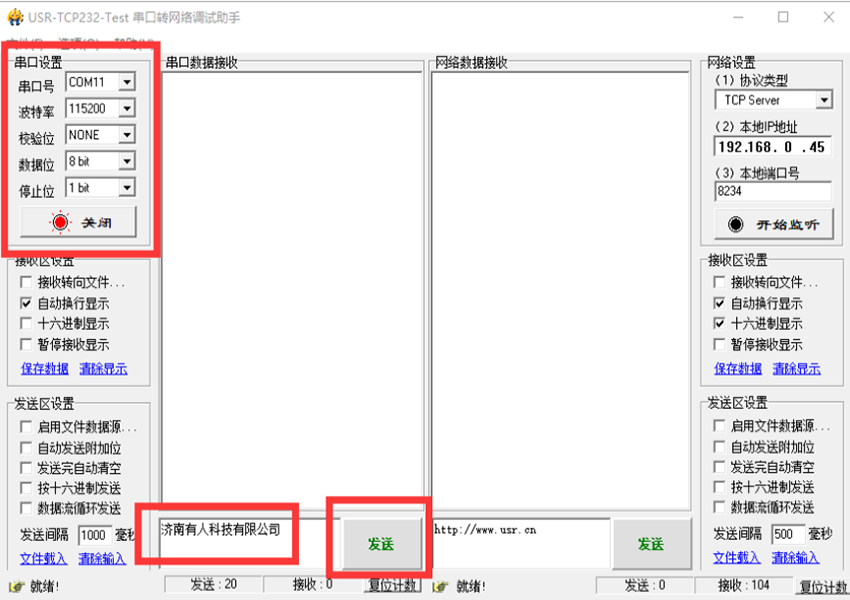 4、重啟后,在串口發(fā)送區(qū)發(fā)送數(shù)據(jù),此時(shí)在服務(wù)器上可以接收到串口發(fā)送的數(shù)據(jù),如圖
