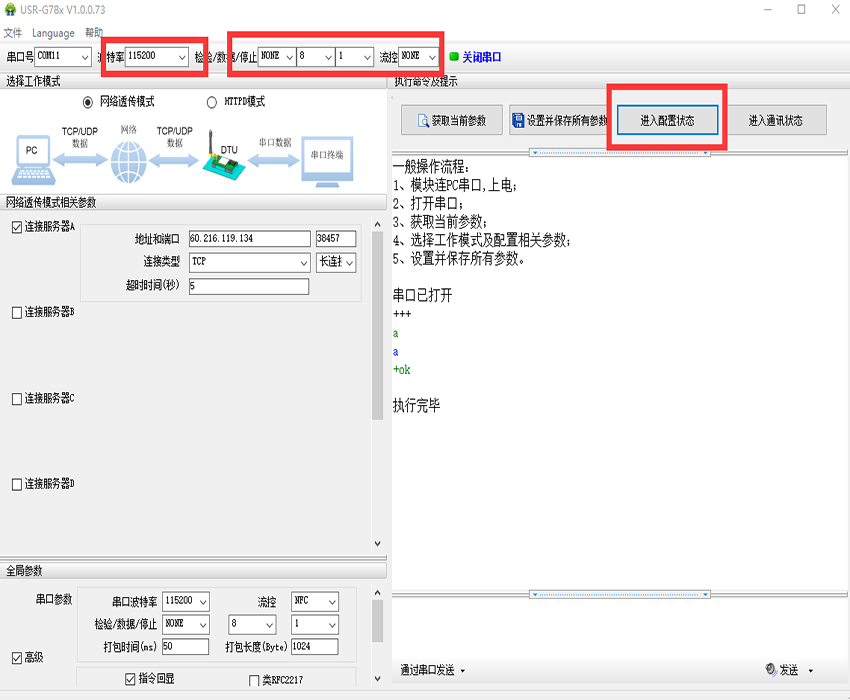 1、將USR-LTE-7S4模塊插入評估板,插入sim卡,串口連接電腦,打開參數(shù)設(shè)置軟件(下載地址http://m.lifj.com.cn/Download/415.html),模塊默認(rèn)串口參數(shù)是115200,N,8,1。點(diǎn)擊“進(jìn)入配置狀態(tài)”,如圖