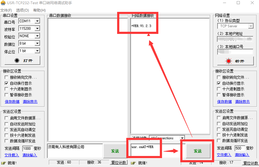 5、通過服務(wù)器端網(wǎng)絡(luò)調(diào)試助手發(fā)送帶有密碼(默認(rèn)是usr.cn)的AT指令可以實(shí)現(xiàn)網(wǎng)絡(luò)AT指令功能,如查詢模塊版本號可以發(fā)送:usr.cnAT+VER?跟回車,如圖