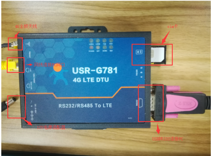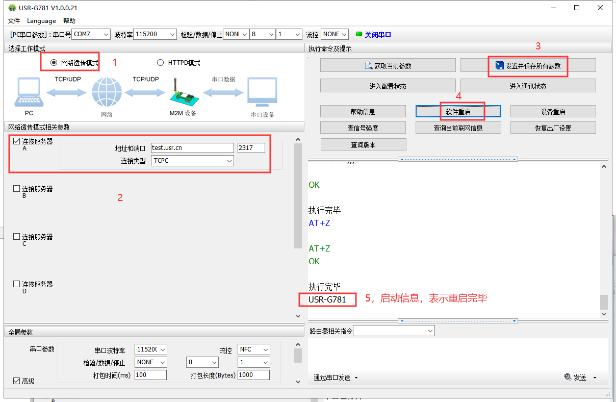 5>待重啟完畢后會在串口打印USR-G781字樣,表示設(shè)備啟動(dòng)完成。設(shè)備上的linkA指示燈常亮,表示socketA建立連接