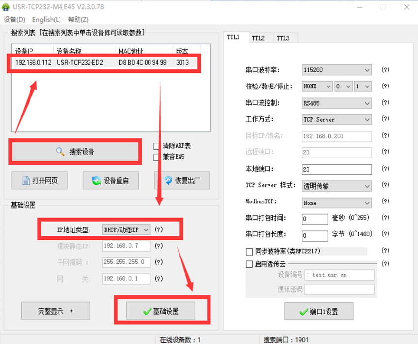 1、將M4模塊網(wǎng)線直連電腦,打開(kāi)參數(shù)設(shè)置軟件(下載地址http://m.lifj.com.cn/Download/90.html),點(diǎn)擊“搜索設(shè)備”,點(diǎn)擊搜索到的設(shè)備名稱(chēng),將IP類(lèi)型改為“DHCP”,點(diǎn)擊“保存參數(shù)”,如圖