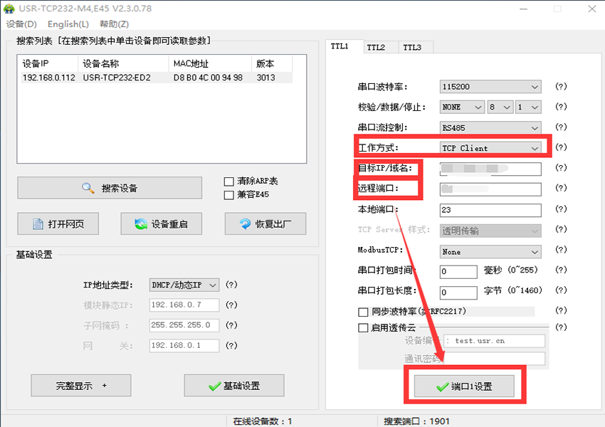 3、將M4模塊網(wǎng)線直連路由器,電腦連入該路由器,打開(kāi)參數(shù)設(shè)置軟件,重新搜索設(shè)備,設(shè)置模塊工作方式為“TCP Client”,目標(biāo)IP設(shè)置為公網(wǎng)服務(wù)器的公網(wǎng)IP,遠(yuǎn)程端口號(hào)為服務(wù)器上上位機(jī)軟件的端口號(hào)。點(diǎn)擊“保存參數(shù)”,如圖