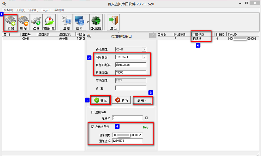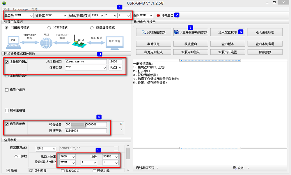 二、設(shè)置730需要連接到的服務(wù)器地址:cloud.usr.cn,端口號(hào):15000,連接類型:TCP長(zhǎng)連接