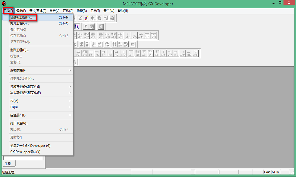 七、打開三菱上位機(jī)軟件GX,點(diǎn)擊“工程-創(chuàng)建新工程”
